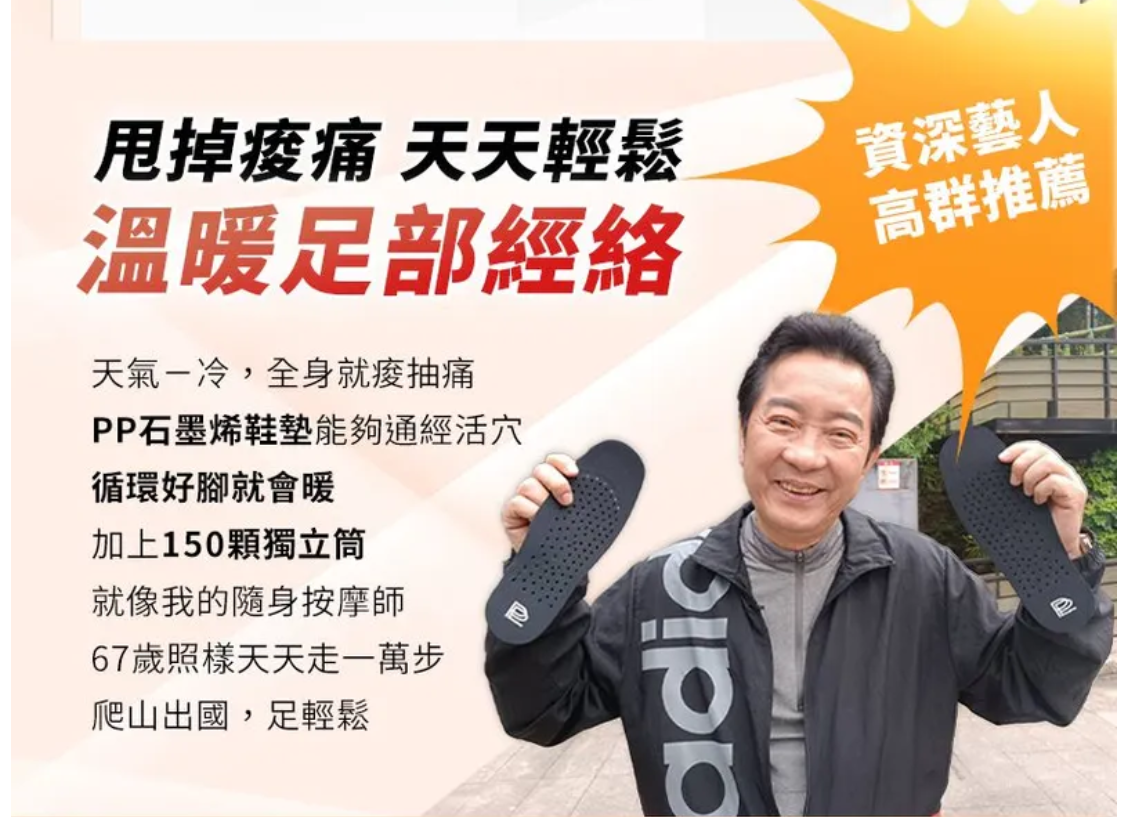 2分鐘前—PP石墨烯超導循環獨立筒鞋墊— 您隨身的足部按摩師!! , 150顆獨立筒 ⇉ 支撐身體 平均分散受力 ,HSG蜂巢式石墨烯⇉ 促進下半身血液循環 ,科技石墨烯面料 ⇉ 快速升溫 提高保暖度 ,打通腳底66個重要穴道, 刺激經絡穴脈 促進五臟六腑循環『腳若暖、全身通』 - 【今日限定】石墨烯鞋墊-男款-1雙 - NT$ 980