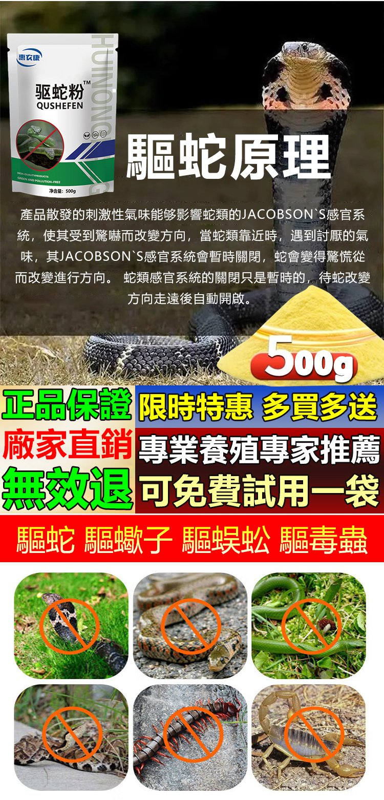 11分鐘前【强效驅蛇粉】千米内無蛇,不毒家禽, 保護家禽,驅蛇/驅蠍子/驅蜈蚣/驅毒蟲,一撒驅蛇蟲,時效可達90天,不怕雨淋 - 【破盤嗨購】買二送三 5入組 NT$-1498